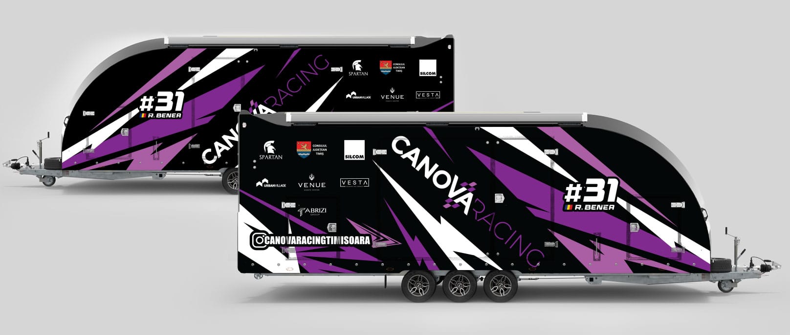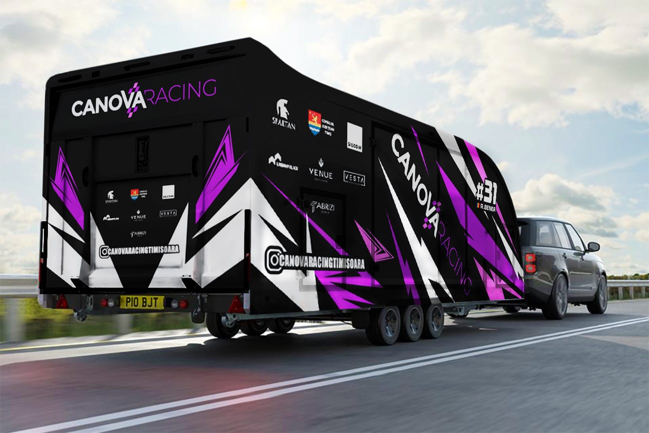 The trailer identity relies on a striking color combination – black, white and violet – selected to convey speed, energy and competitive spirit. Dynamic graphic elements composed of sharp lines and geometric shapes suggest motion and thrust, turning the trailer’s large surface into a powerful visual canvas. A diagonal placement of the “CANOVA RACING” wordmark becomes a distinctive signature visible from a distance.